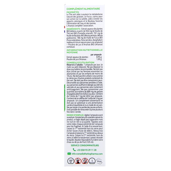 Extrait aqueux de plantes BIO [obtenu à partir de 926 mg de feuille de Thé vert BIO (Camellia sinensis), 741 mg de feuille de Bouleau BIO (Betula pendula, Betula pubescens), 186 mg de thalle de Fucus BIO (Fucus vesiculosus, Fucus serratus, Ascophyllum nodosum) mis en œuvre pour une ampoule] – Poudre de jus d’Ananas BIO (Ananas comosus).