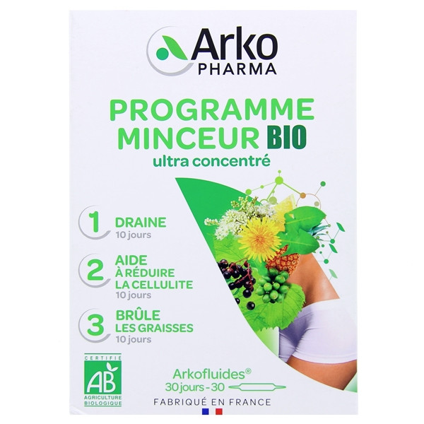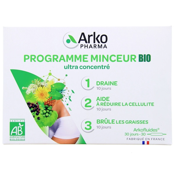 Le Programme Minceur Bio Arkofluides du laboratoire Arkopharma contient des principes actifs naturels et une formule ultra concentré. Il comporte 3 étapes d'une durée de 30 jours : drainage, réduction de la cellulite et brûlage de graisses.