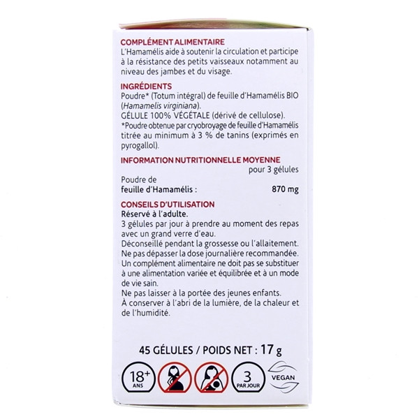 Le complément alimentaire Arkogélules Hamamélis Bio du laboratoire Arkopharma contribue à soutenir la circulation et à la résistance des petits vaisseaux notamment au niveau des jambes et du visage.