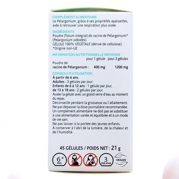 Le complément alimentaire Arkogélules Pelargonium puise dans les actifs contenus dans cette plante pour soulager les gênes ressenties au niveau de la sphère respiratoire. La prise de ce complément alimentaire est surtout recommandée pendant la période hivernale.