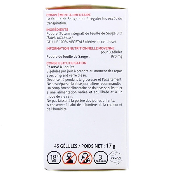 Arkogélules Sauge Bio est un complément alimentaire spécialement élaboré pour faciliter la digestion. Il permet également de diminuer les sueurs nocturnes en période de ménopause. Il se dote d’une composition d’origine biologique hautement concentrée en actifs ciblés. Il est conçu à partir d’ingrédients d’origine naturelle sans produits chimiques de synthèse ni OGM.