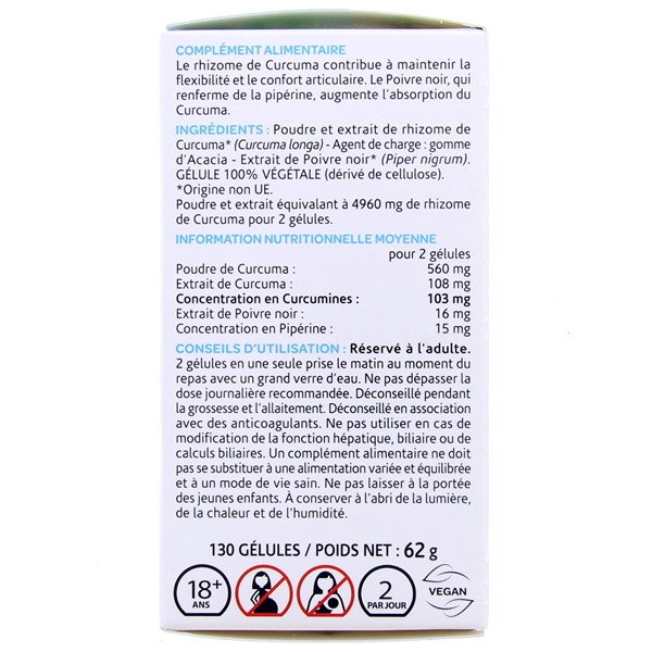 Arkogélules Curcuma Pipérine est conditionné en boîte de 130 gélules pour un programme de 65 jours.