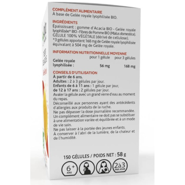Épaississant : gomme d’Acacia BIO. Gelée royale lyophilisée (1) BIO. Fibres de Pomme BIO (Malus domestica). GÉLULE 100 % VÉGÉTALE (dérivé de cellulose).