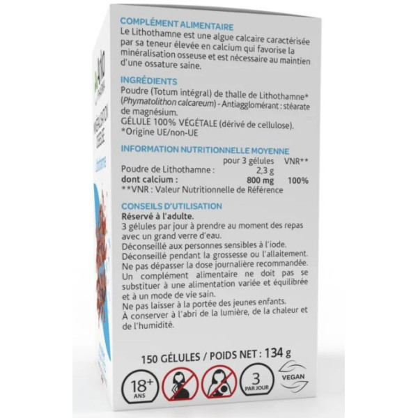 Le complément alimentaire Arkogélules Lithothamne du laboratoire Arkopharma contient des principes actifs du lithothamne qui favorise la minéralisation osseuse et est nécessaire au maintien d'une ossature normale.
