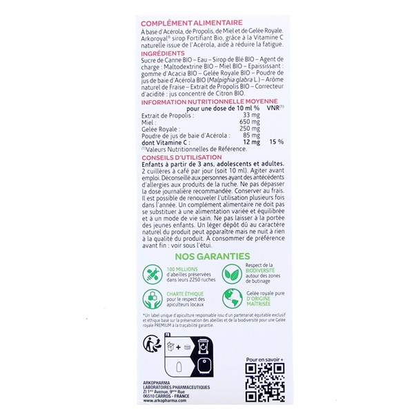 Arkoroyal Junior Sirop Fortifiant Bio favorise la vitalité chez les enfants dès 3 ans. Idéal à la rentrée et aux changements de saisons, il est conçu avec un bon goût de fraise. Sans colorant et sans édulcorant, il est formulé à base de gelée royale contenant principalement de l’eau, des protéines et des sucres. Ce sirop renferme également des lipides, des minéraux, des vitamines et des acides gras comme le 10 -HDA. Acide gras spécifique de la gelée royale. Cet ingrédient est très sollicité pour ses activités immunomodulatrices et antibactériennes.