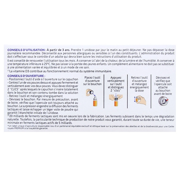 Eau purifiée – Sucre – Sirop de glucose déshydraté – Stabilisant : sorbitol – Gelée royale lyophilisée – Ferments lactiques (1) : Lactobacillus paracasei, Bacillus coagulans, Lactobacillus acidophilus, Lactobacillus plantarum et Bifidobacterium lactis – Arôme naturel d’orange – Amidon de maïs – Conservateurs : sorbate de potassium et benzoate de sodium – Acidifiant : acide citrique – Antiagglomérants : dioxyde de silicium et stéarate de magnésium – Vitamine D3.