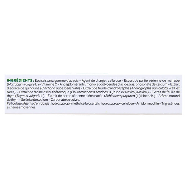 Épaississant : gomme d’acacia – Agent de charge : cellulose – Extrait de partie aérienne de marrube (Marrubium vulgare L.) – Vitamine C – Antiagglomérants : mono- et diglycérides d’acide gras, phosphate de calcium – Extrait d’écorce de quinquina (Cinchona pubescens Vahl) – Extrait de feuille d’andrographis (Andrographis paniculata Wall. ex Nees) – Extrait de racine d’éleuthérocoque (Eleutherococcus senticosus (Rupr. ex Maxim.) Maxim.) – Extrait de feuille de thym (Thymus vulgaris L.) – Extrait de partie aérienne d’échinacée (Echinacea purpurea (L.) Moench.) – Arôme naturel de thym – Sélénite de sodium – Carbonate de cuivre.