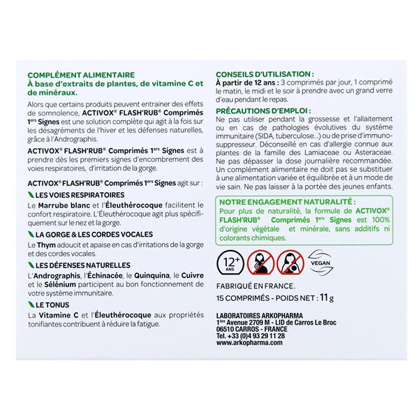 Flash'Rub 1ᵉʳˢ Signes en comprimés du laboratoire Arkopharma libère les voies respiratoires, soulage les irritations de la gorge et soutient les défenses immunitaires et le tonus. Avec ses 6 extraits de plantes, de vitamine C et de minéraux, Flash'Rub est un complément alimentaire sans somnolence.