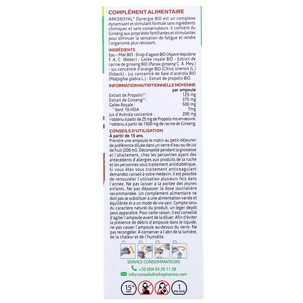 Arkoroyal Dynergie Bio d'Arkopharma est un complexe dynamisant et stimulant à base de Ginseng, d'Acérola, de Propolis et de Gelée Royale. Il aide à diminuer la sensation de fatigue et à fortifier l'organisme.