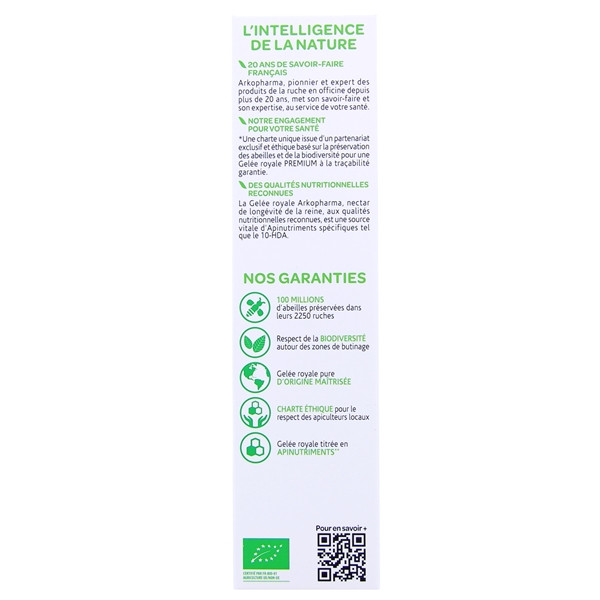 Arkopharma assure la qualité de ses produits grâce à des composants sélectionnés avec soin et à une traçabilité rigoureuse. De plus elle possède une certification biologique.