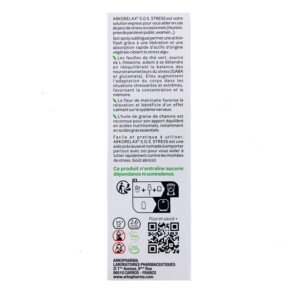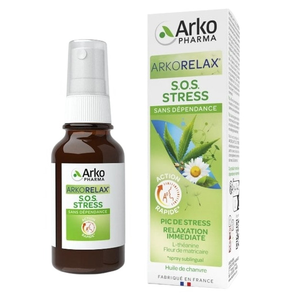Arkorelax SOS Stress d'Arkopharma est un complément alimentaire sans dépendance, sous forme de spray, formulé à base de L-théanine, de fleur de matricaire et d'huile de chanvre. Ce spray permet de vous aider à vous relaxer rapidement en cas de pics de stress occasionnels (examen, réunion, prise de parole en public…).