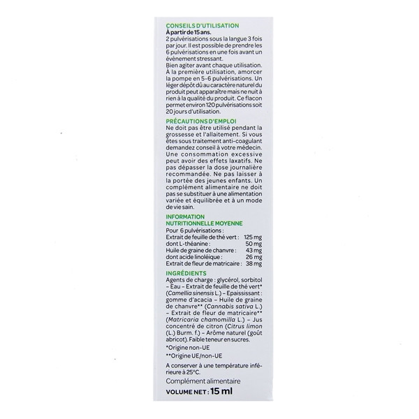 Agents de charge : glycérol, sorbitol – Eau – Extrait de feuille de thé vert (Camellia sinensis) (125 mg, dont L-Théanine 50 mg pour 6 pulv.) – Épaississant : gomme d’acacia – Huile de graine de chanvre (Cannabis sativa) (43 mg pour 6 pulv.) – Extrait de fleur de matricaire (Matricaria chamomilla) (38 mg pour 6 pulv.) – Jus concentré de citron (Citrus limon) – Arôme naturel.