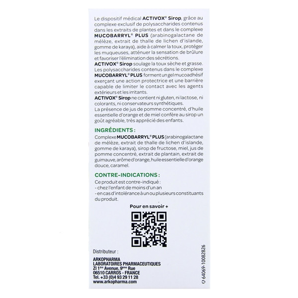 Activox Sirop Toux Sèche & Grasse des laboratoires Arkopharma est formulé avec des ingrédients 100 % d'origine naturelle. Il est indiqué pour calmer les toux sèches et grasses, atténuer les sensations de brûlure et protéger les muqueuses. Il est destiné aux adultes et aux enfants dès 12 mois.