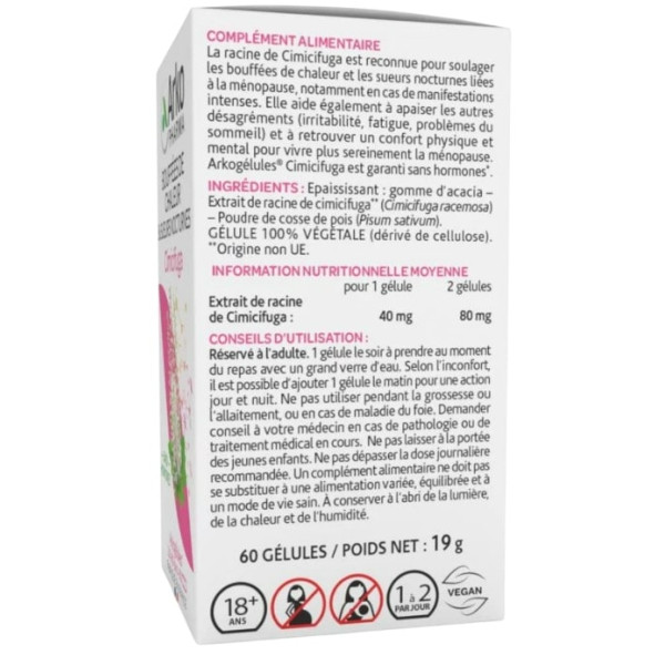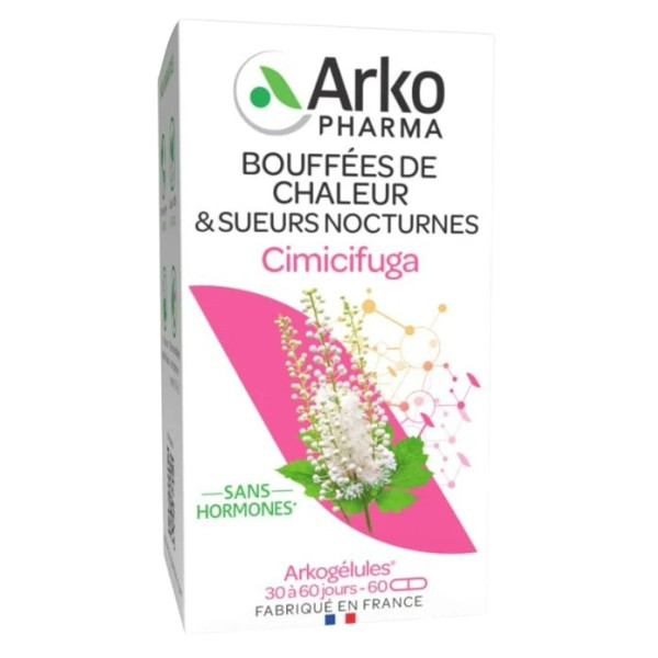 Les gélules Arkogélules Cimicifuga des laboratoires Arkopharma possède une formule hautement concentrée en racine de Cimicifuga et sans hormones pour soulager les bouffées de chaleur et les sueurs nocturnes liées à la ménopause.