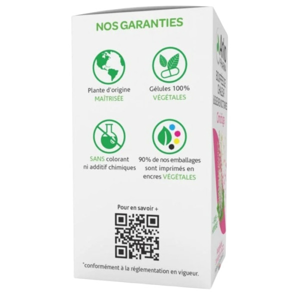 Epaississant : Gomme d’acacia – Extrait de racine de cimicifuga** (Cimicifuga racemosa) – Poudre de cosse de pois (Pisum sativum). GÉLULE 100 % VÉGÉTALE (dérivé de cellulose). **Origine non UE.