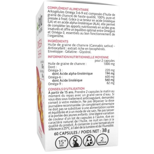 Le complément alimentaire Arkogélules Oméga 3-6-9 du laboratoire Arkopharma est composée d'huile de graine de chanvre de haute qualité. Les Oméga 3-6-9 sont essentiels au bon fonctionnement de l'organisme.