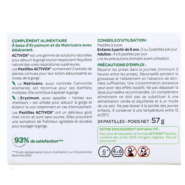 Activox® Pastilles doit précisément ses effets apaisants aux extraits de deux plantes. Cela renvoie notamment à l'Erysimum et à la Matricaire connues pour avoir la capacité d’adoucir les irritations de la gorge.
