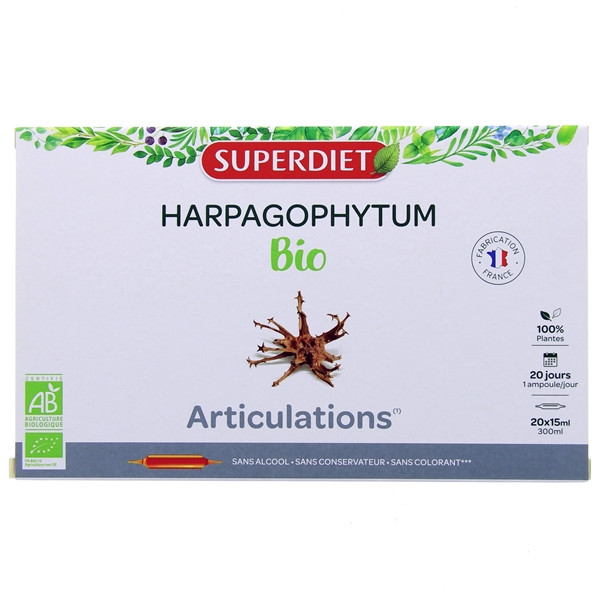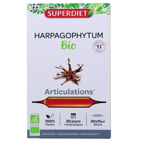 Le complément alimentaire Harpagophytum bio est un produit proposé par le laboratoire Super Diet. Ce complément alimentaire bénéficie d'une formule enrichie en extraits liquides et pur jus d'Harpagophytum, d'origine biologique. Ces extraits sont le résultat de deux procédures d'extraction utilisées par le laboratoire pour conserver les spécificités des principes actifs. Les racines d'Harpagophytum bio présentes dans ce complément alimentaire possèdent des propriétés détoxifiantes et dépuratives. Elles favorisent le bien-être des articulations en soulageant durablement les inflammations.