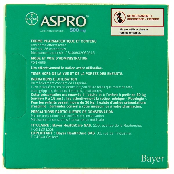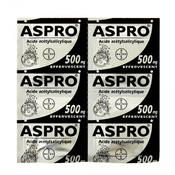 Médicament sans ordonnance des laboratoires Bayer, Aspro est dosé à 500mg d'aspirine. Le médicament Aspro est indiqué notamment pour soulager les douleurs et les courbatures, les maux de tête ou encore les états fébriles et grippaux. Aspro 500mg est disponible en boîte de 36 comprimés effervescents