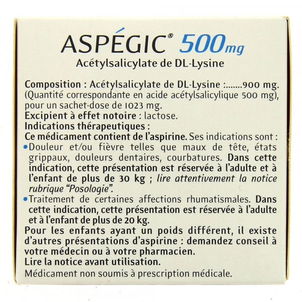 L'Aspegic 500mg est disponible en boîte de 30 sachets.