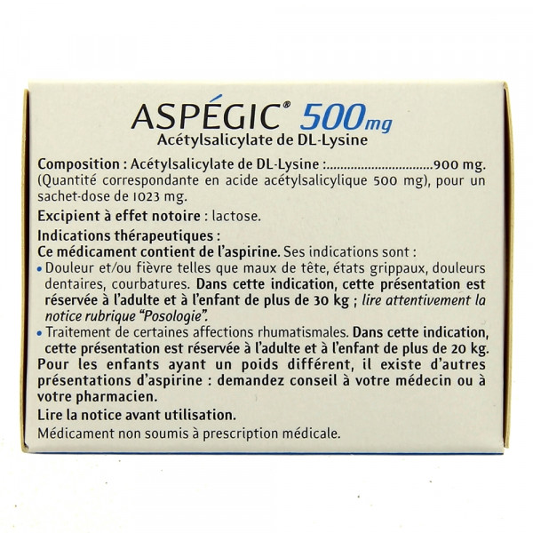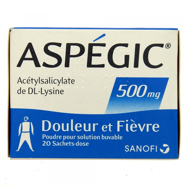 L'Aspegic 500mg est disponible en boîte de 20 sachets.