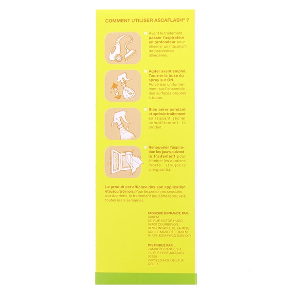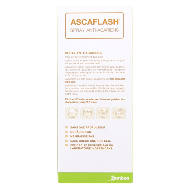 Ascaflash Spray Anti-Acariens est un traitement préventif et curatif contribuant à assainir de façon efficace votre habitat. Ce produit permet de lutter contre les acariens à l’origine de nombreuses allergies : conjonctivite, rhinite, etc. Ce spray peut être utilisé sur le lit, le matelas, la moquette, les tapis, les sièges de voitures, etc.