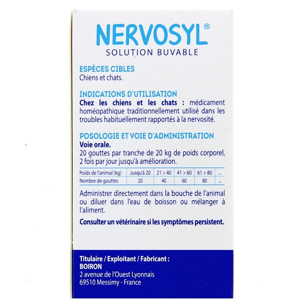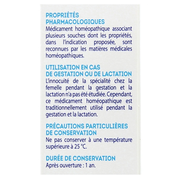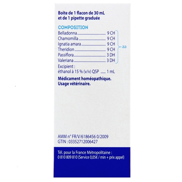 Médicament homéopathique traditionnellement utilisé dans les troubles habituellement rapportés à la nervosité. Indiqué chez les chats, chattes, chatons, chiens, chiennes et chiots.