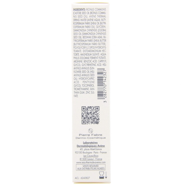 Ricinus Communis (Castor) Seed Oil (Ricinus Communis Seed Oil). Avene Thermal Spring Water (Avene Aqua). Butyrospermum Parkii (Shea) Oil (Butyrospermum Parkii Oil). Glycerin. Simmondsia Chinensis (Jojoba) Seed Oil (Simmondsia Chinensis Seed Oil). Beeswax (Cera Alba). Butyrospermum Parkii (Shea) Butter (Butyrospermum Parkii Butter). Polyglyceryl-2 Dipolyhydroxystearate. Disteardimonium Hectorite. Magnesium Sulfate. Aquaphilus Dolomiae Ferment Filtrate. Arginine. Benzoic Acid. Caprylyl Glycol. Glycyrrhetinic Acid. Helianthus Annuus (Sunflower) Seed Oil (Helianthus Annuus Seed Oil). Hydroxycapric Acid. Pentylene Glycol. Tocopherol. Tromethamine. Xanthan Gum. Zinc Sulfate.