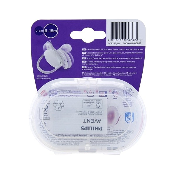 Les sucettes Ultra Soft 6-18 m de la marque Avent ont été spécialement conçues pour les peaux sensibles des bébés entre 6 et 18 mois. Elles possèdent avec une collerette flexible pour limiter les marques et les irritations afin de garder une peau douce.