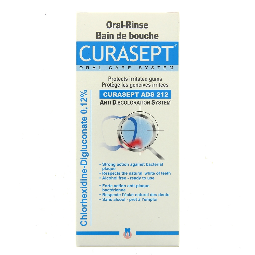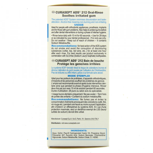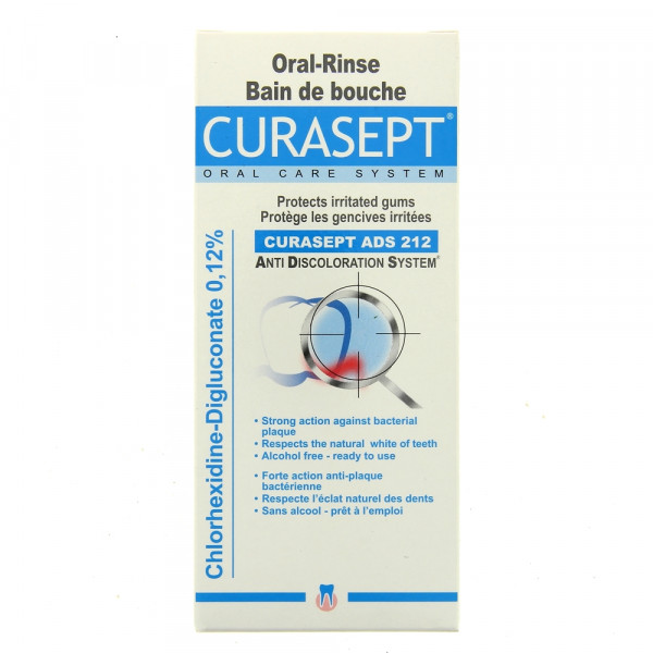 La solution buccale Curasept ADS 212 est un bain de bouche. Elle est parfaitement adaptée aux porteurs de prothèses dentaires, d'appareils dentaires et d'implants. Elle constitue une solution efficace contre les plaques, les tâches dentaires ainsi que les problèmes de gencives. Avec le système ADS ou Anti Discolation System, ce bain de bouche diminue les risques de coloration brune et évite l'altération du goût. Ses principes actifs possèdent des fonctions antiplaques, antibactériennes et permettent de protéger les gencives irritées. Ce produit est également efficace pour assurer le respect de l'éclat naturel des dents.