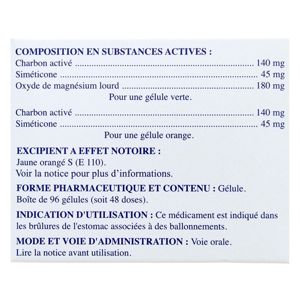 Ce médicament associe du charbon activé et un pansement digestif au silicone, qui protègent le tube digestif et combattent la production de gaz. La gélule verte contient également un antiacide d'action locale qui neutralise les acides sécrétés par l'estomac.