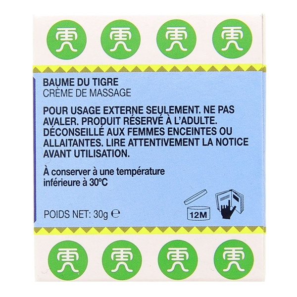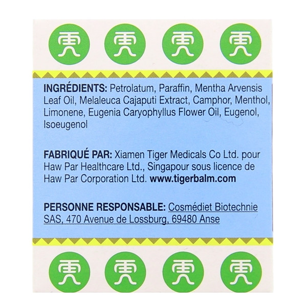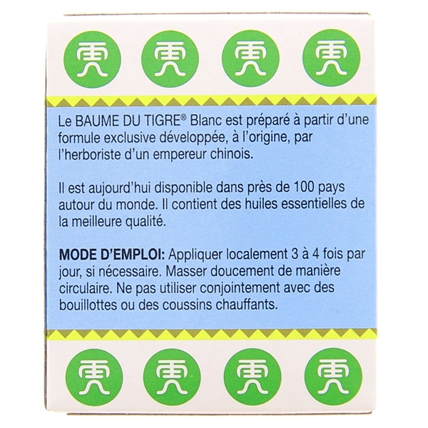 Tiger Balm - Baume du Tigre Blanc est préparé à partir d'une formule exclusive développée, à l'origine, par l'herboriste d'un empereur chinois. Ce baume procure une sensation de froid. Il peut s'utiliser en hiver en massage de la poitrine, en massage des tempes ou en massage de récupération après l'effort (sportifs).