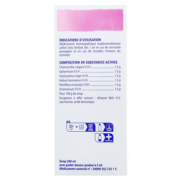 Chamomilla vulgaris 9 CH, Gelsemium 9 CH, Hyoscyamus niger 9 CH, Kalium bromatum 9 CH, Passiflora incarnata 3 DH, Stramonium 9 CH, aa. Alcool, saccharose.