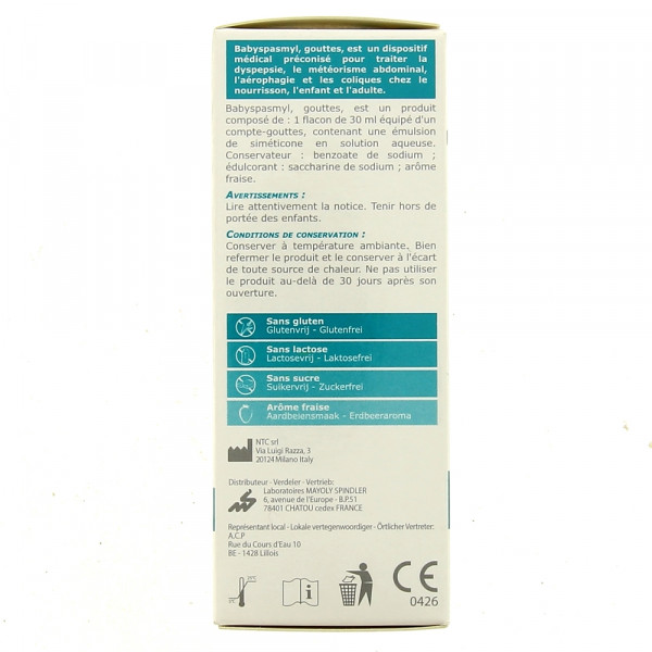 BabySpasmyl est un dispositif médical indiqué dans le traitement de la colique du nourrisson, de l'aérophagie, des ballonnements et des troubles digestifs chez l'adulte, l'enfant et le nourrisson de plus de 1 mois.