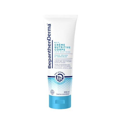 BepanthenDerma Crème Nutritive Corps est un soin quotidien pour les peaux sèches et sensibles. La crème hydrate dès sa première application et durablement (jusqu'à 48 h) pour une peau souple et douce.
