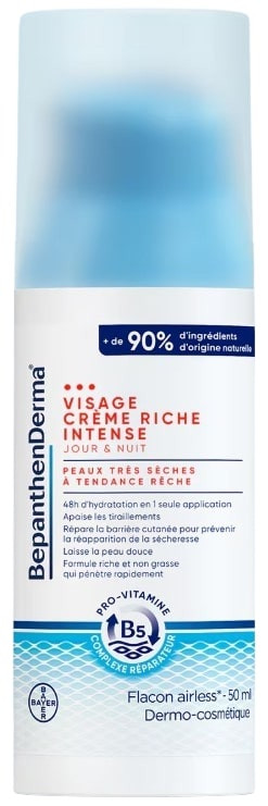 La Crème Riche Intense Visage BepanthenDerma fait partie de la gamme de soins BepanthenDerma spécialement conçue pour les peaux très sèches et rugueuses. Elle agit pendant 48 heures après une unique application pour soulager les sensations de tiraillement associées à la sécheresse cutanée.