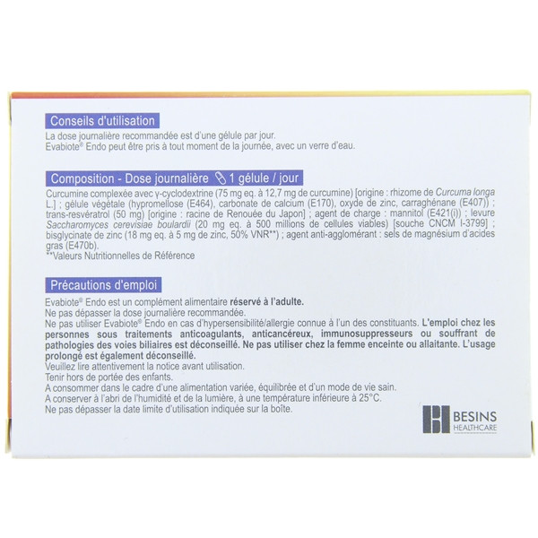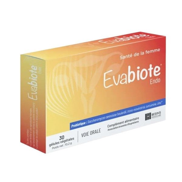 Evabiote Endo est un complément alimentaire à base d'une souche probiotique (Saccharomyces cerevisiae boulardii [CNCM I-3799]), de polyphénols et de zinc pour contribuer à une fertilité et une reproduction normales, au fonctionnement normal du système immunitaire et à protéger les cellules contre le stress oxydatif.