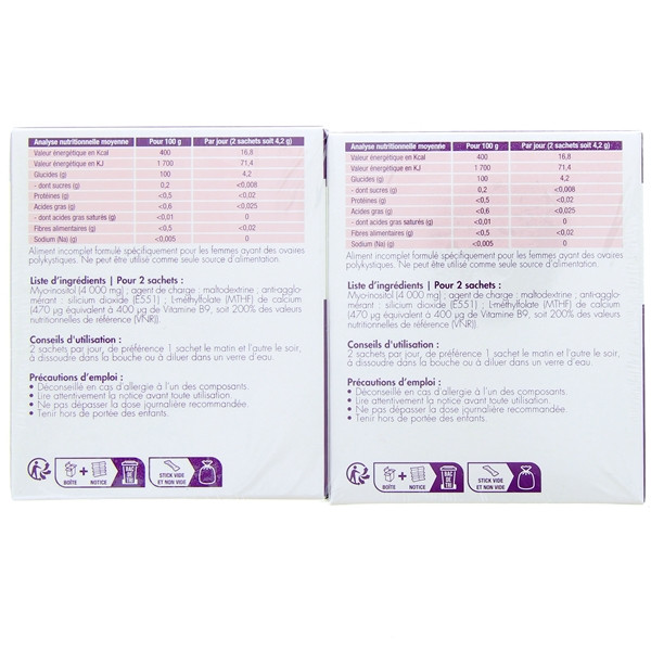 Besins International Gynositol Ovaires Polykystiques contient essentiellement du myo-inositol, une molécule naturelle indispensable pour le bon fonctionnement des cellules et qui intervient en particulier au niveau des ovaires. Ce complément alimentaire soulage sensiblement les symptômes du SOPK et restaure rapidement le taux d’ovulation, à condition qu’il soit accompagné d’une nourriture variée, équilibrée et d’une activité physique régulière. Le myo-inositol aide aussi à corriger toute éventuelle résistance à l’insuline qui affecte la plupart des femmes touchées par le SOPK. La formule inclut également de la vitamine B9 (5-MTHF) qui rétablit le statut en folates et prémunit les futures mamans contre tout risque d’anomalie de leur fœtus. Conditionnement : lot de 2 boîtes de 30 sachets.