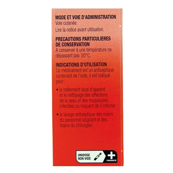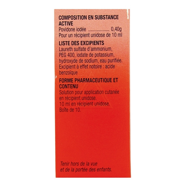 Évitez l'usage prolongé de ce médicament, notamment chez l'enfant, sur les muqueuses et sur des surfaces étendues ou profondément lésées, sans l'avis de votre médecin : risque de passage de l'iode dans le sang, susceptible d'entraîner une perturbation du fonctionnement de la thyroïde.