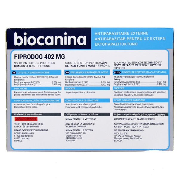 Fiprodog 402mg Spot-on Chiens XL de Biocanina est un traitement antiparasitaire externe indiqué chez les très grands chiens (40 à 60 kg). Cette solution spot-on permet de lutter efficacement contre les tiques et les puces.