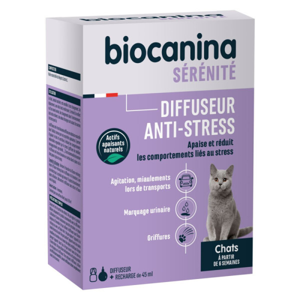Les chats peuvent facilement se trouver stresser pour plusieurs raisons : un visiteur, un bruit intempestif, l’arrivée d’un nouvel animal, l’absence de son maître, un meuble déplacé, un déménagement, etc. En effet, les chats ne réagissent pas toujours bien à des changements dans leur quotidien. Dans ces circonstances, ils peuvent se replier sur eux même, se cacher et développer des comportements destructeurs. Votre chat est-il plus distant ou agressif que d’ordinaire ? Est-ce qu’il miaule énormément, perd son appétit ou au contraire devient boulimique ? Il se peut qu’il soit très stressé. Pour l’aider à retrouver son calme, Biocanina vous propose un diffuseur anti stress pour chat.