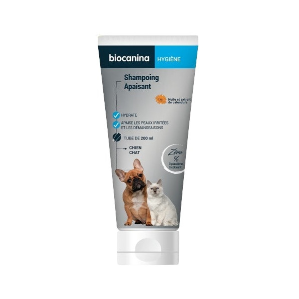 Le shampoing apaisant de Biocanina est à l'huile et l'extrait de calendula. Ce shampoing nettoie, hydrate et apaise les peaux irritées et les démangeaisons.