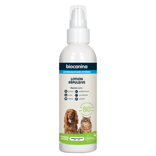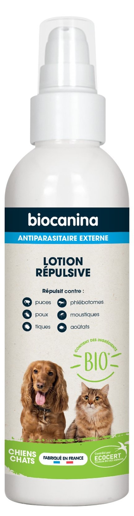 La Lotion Répulsive Bio de Biocanina est un antiparasitaire externe pour les chiens et les chats. Cette lotion permet de repousser les puces, les poux, les tiques, les phlébotomes, les moustiques et les aoûtats.
