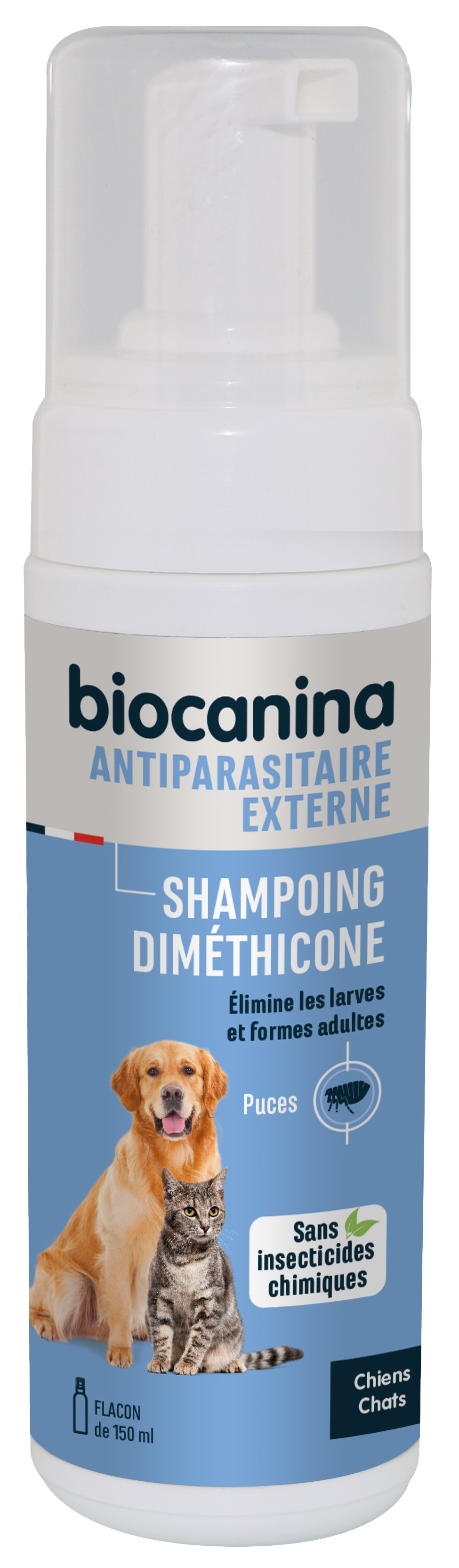 Le Shampoing Dimethicone Chien & Chat sans pesticide de Biocanina permet d'éliminer les larves et les formes adultes de puces.