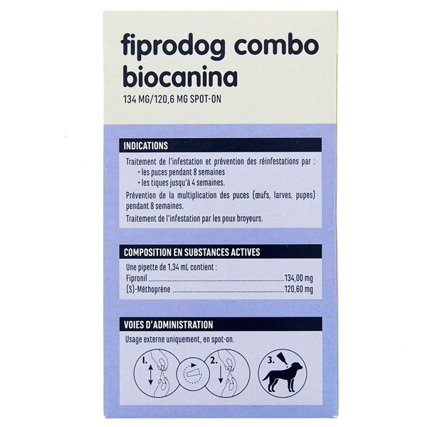 Fiprodog Combo Moyens Chiens de Biocanina est un antiparasitaire externe pour les chiens de 10 à 20 kg. Il est indiqué dans le traitement de l'infestation et dans la prévention des réinfestations par les puces, les tiques et les poux broyeurs.