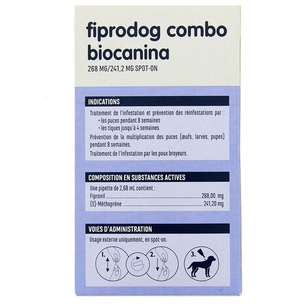 Les pipettes Biocanina Fiprodog Combo sont destinées pour le traitement des infestations mixtes par les puces et les tiques à base de fipronil. Cet antiparasitaire externe effectue une action insecticide persistant pendant 8 semaines contre les puces et une action acaricide d’environ 4 semaines. Il permet également de traiter l’infestation par les poux broyeurs. Il peut aussi être utilisé dans le cadre d’un programme de traitement de la Dermatite par Allergie aux Piqûres de Puces ou DAPP préalablement diagnostiquée par le vétérinaire.