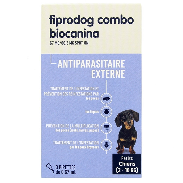 Votre chien souffre-t-il d’irritations et/ou de démangeaisons à cause d’une invasion de puces ou de tiques ? Agissez dès maintenant et n’attendez pas que ces piqûres nuisent à leur santé grâce aux pipettes Fiprodog Combo pour petits chiens. Il s’agit d’un traitement antiparasitaire externe développé par la marque spécialiste du bien-être et de la santé animale Biocanina. Indiquées pour les chiens pesant entre 2 et 10 kg, ces pipettes sont formulées à base de fipronil, un actif insecticide et acaricide.
