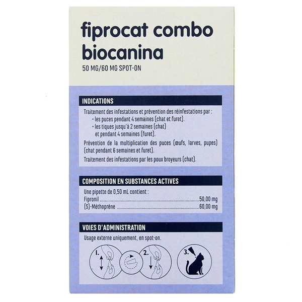 Fiprocat Combo Chats & Furets de Biocanina est un antiparasitaire indiqué dans le traitement de l'infestation et dans la prévention des réinfestations par les puces, les tiques et les poux broyeurs.