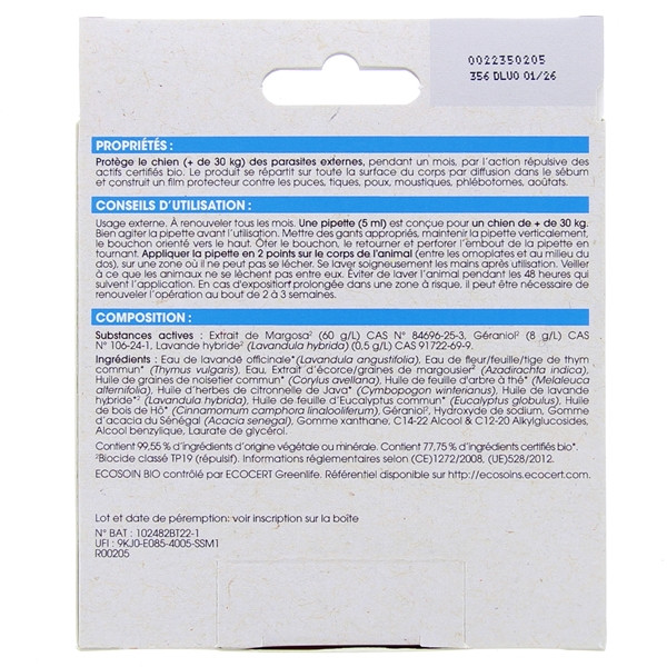 Les pipettes répulsives bios pour chiens de plu s de 30 kg offrent une protection efficiente contre les parasites et les insectes. Son effet dure pendant un mois. Elles utilisent des actifs certifiés bios pour créer une barrière naturelle contre les puces, les tiques, les poux, les moustiques, les phlébotomes et les aoûtats.