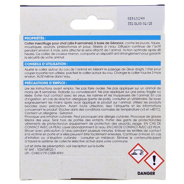 Ajuster le collier autour du cou du chat en laissant un espace de deux doigts entre la peau et le collier. Cet écart est nécessaire afin de garantir que l’animal puisse bien respirer lors du port du dispositif. Couper l’excédent puis fixer le collier autour du cou. Changer le collier répulsif tous les 3 mois.